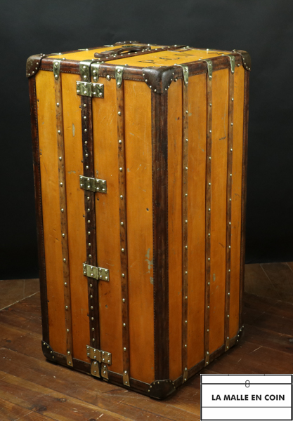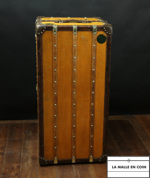 Malle armoire Louis Vuitton Penderie a gauche avec cintres homme Tiroirs a droite Toile vuitonitte orange Bordure en cuir naturel Bijouterie en laiton massif 100 % d'origine , exception faite des poignées de tiroirs en cuir naturel refaite a l’identique .