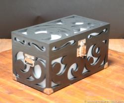 Malle plate faite dans nos ateliers (1 exemplaire unique) Un bois de 20 mm d'épaisseur est découpé à la scie sauteuse. Chaque face de la malle est occultée d'un plexiglass blanc diffusant à 84% Une lampe insérée à l'arrière du couvercle permet de conserver l'espace normal de rangement de la malle Serrure acier avec clef Elle trouvera sa place en lampe d'ambiance dans une entrée, un salon...