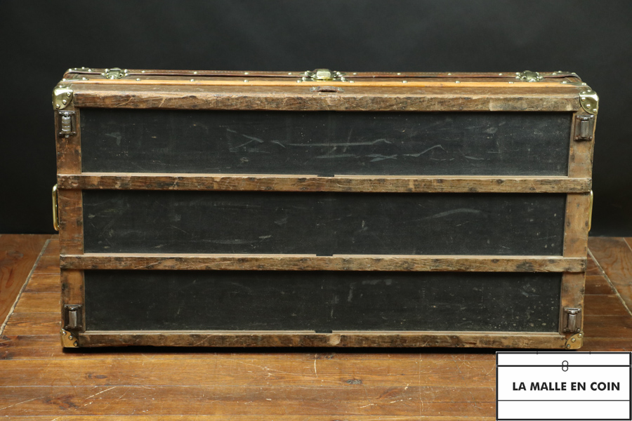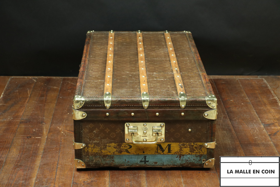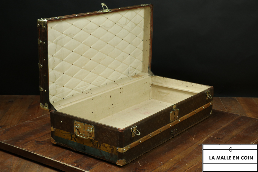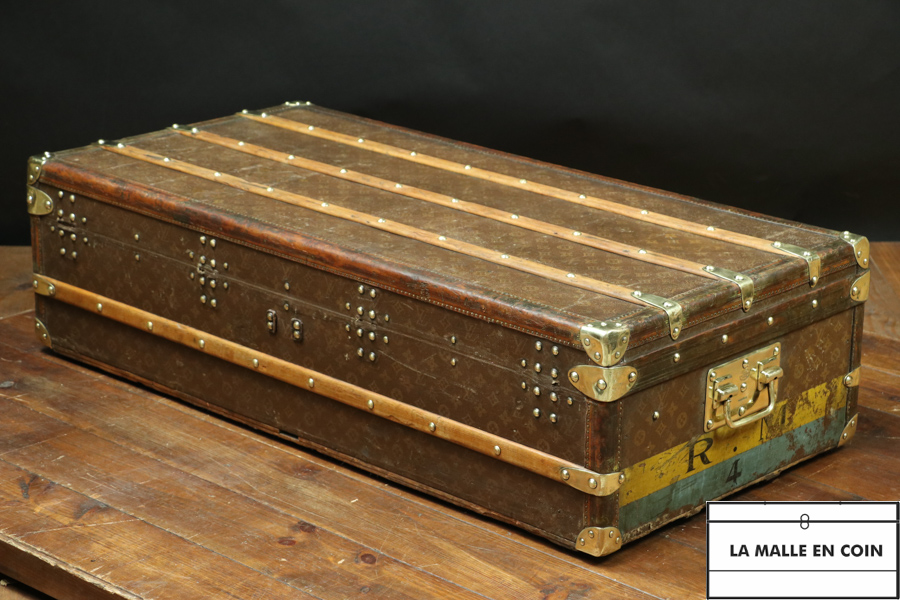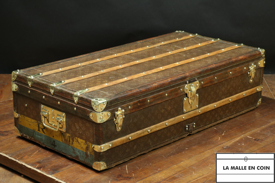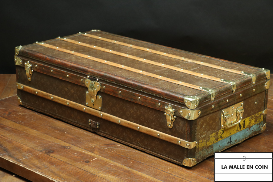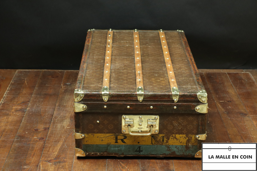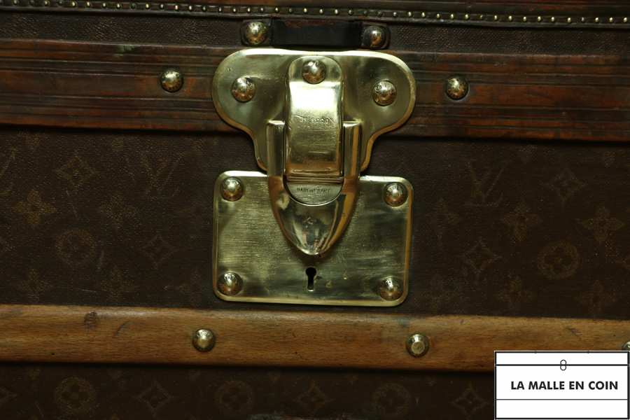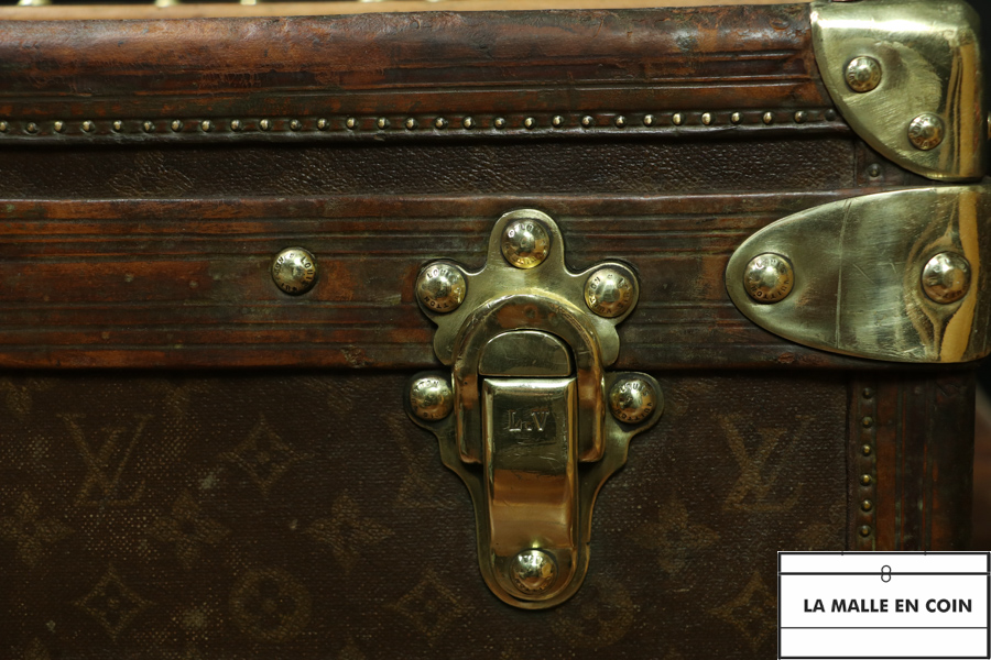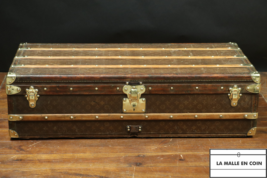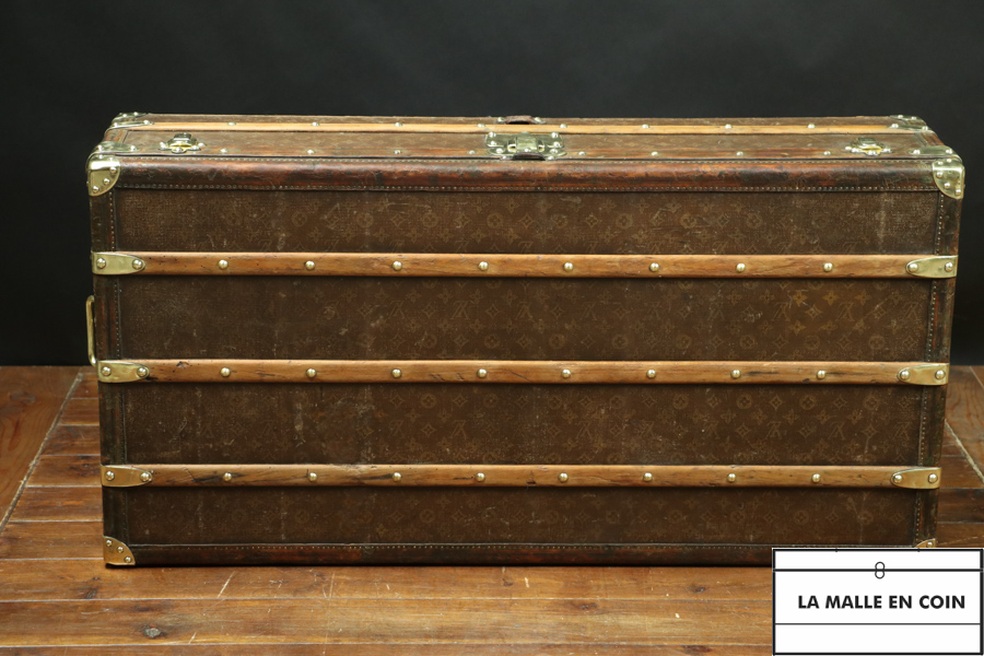 Réalisée en toile monogram emblématique, elle présente une patine exceptionnelle, témoin de son histoire et de ses voyages passés. Ses renforts en laiton, ses lattes en bois et ses fermoirs d’origine confirment son authenticité et son caractère unique.